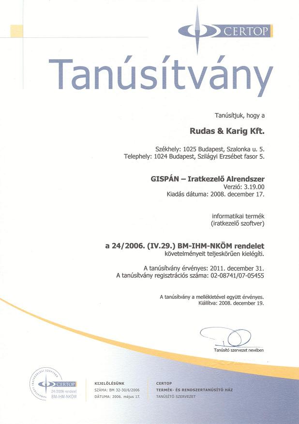 Örömmel értesítünk mindenkit, hogy 2008. december 17-én az iratkezelő rendszerünk auditora hivatalosan tanúsította, hogy a Rudas és Karig Kft. Iratkezelő alrendszere a 24/2006. (IV.29.) BM - IHM - NKÖM rendelet követelményeit kibővítetten kielégíti.