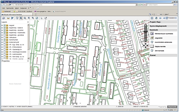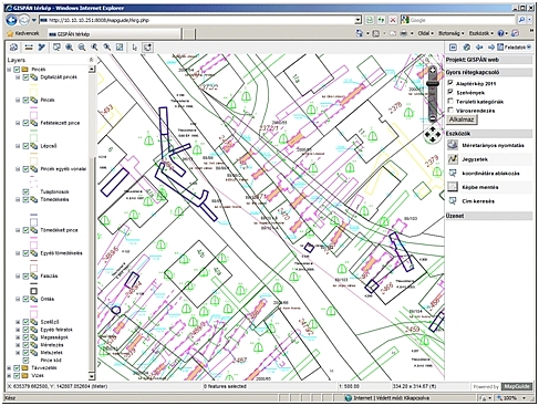 a hivatalon belül széles körben, sőt, akár külső partnerek felé is! A rendszer lekérdező felhasználója megjelenítheti, böngészheti a térképeket, címre, helyrajzi számra kereshet. Kinyomtathatja a térképeket kiválasztott méretarányban és lapméretben, raszteres térképeket, légifotót jeleníthet meg a vektoros térképi rétegek alatt stb. A térképek megváltoztatására azonban nincsen módja. A kényelmesebb, egyszerűbb térképi áttekinthetőséget szolgálja a gyors rétegkapcsoló és az automatikus, méretarányfüggő megjelenítés lehetősége, így a szimbólumok a térkép nagyításától függően automatikusan jelennek meg, vagy tűnnek el. (Pl. bizonyos nagyítás alatt az épület alaprajzok ne jelenjenek meg). Önmagában a web böngészőben történő térképi megjelenítéshez és a fenti funkciókhoz nem szükséges GISPÁN® kliens sem. Azonban, ha a térképi lekérdező felhasználó számára szöveges GISPÁN® kliens is elérhető, akár hagyományos Oracle kliens-szerver módban, akár e-GISPÁN® rendszerben webes felületen, akkor a webes térképeken a megszokott GISPÁN® térinformatikai funkciókat is használhatja („mutasd a rajzon”, leválogatás, lista térképre vetítése, adatlap térképről stb.). |